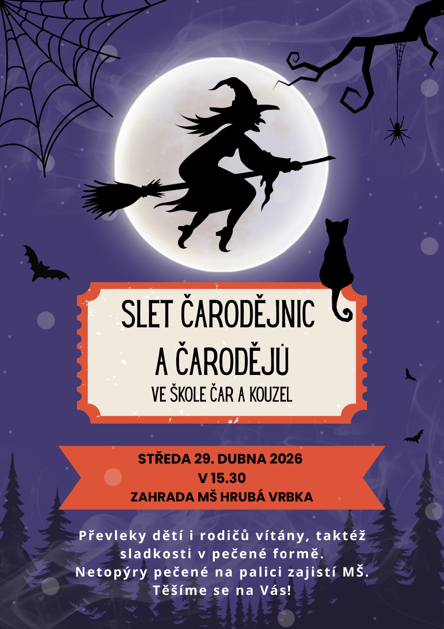 Zveme všechny malé čaroděje a čarodějnice na odpolední školu čar a kouzel. Začátek v 15.30 na zahradě MŠ. Kostýmy vítány i dobroty v pečené formě. Netopýry na palici zajistí MŠ. Vstupné dobrovolné.