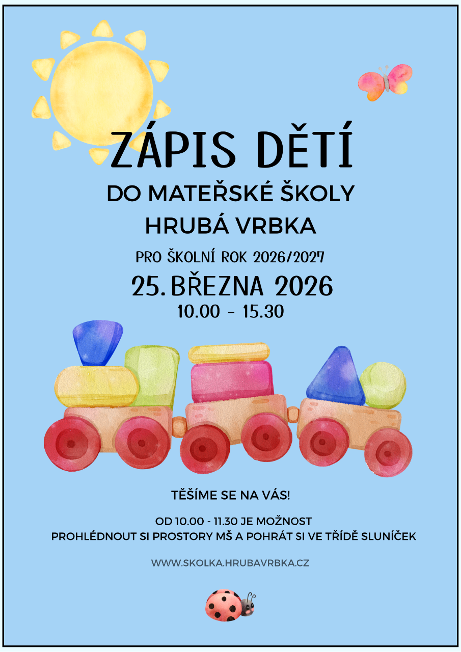 Zápis do MŠ Hrubá Vrbka na školní rok 2026/27 proběhne ve středu 25. března 2026 v čase od 10.00 - 15.30 v budově MŠ.