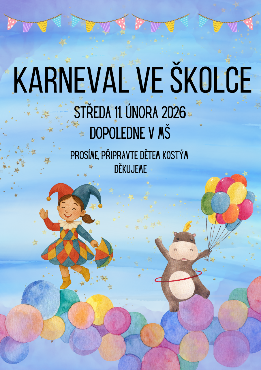 Karneval v MŠ 11.02.2026 07:06 Ve středu 11. února 2026 bude ve školce dopoledne karneval. Rodiče prosíme, aby dětem přichystali kostým. Děkujeme za spolupráci.